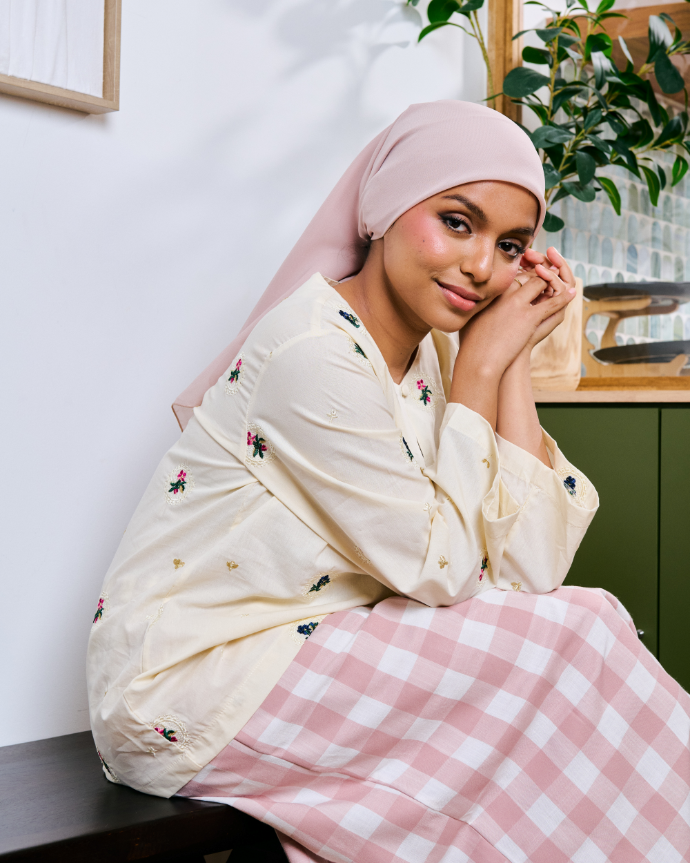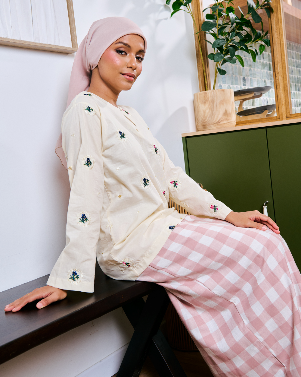 • Lengan baju panjang straight-cut (seperti digayakan model)